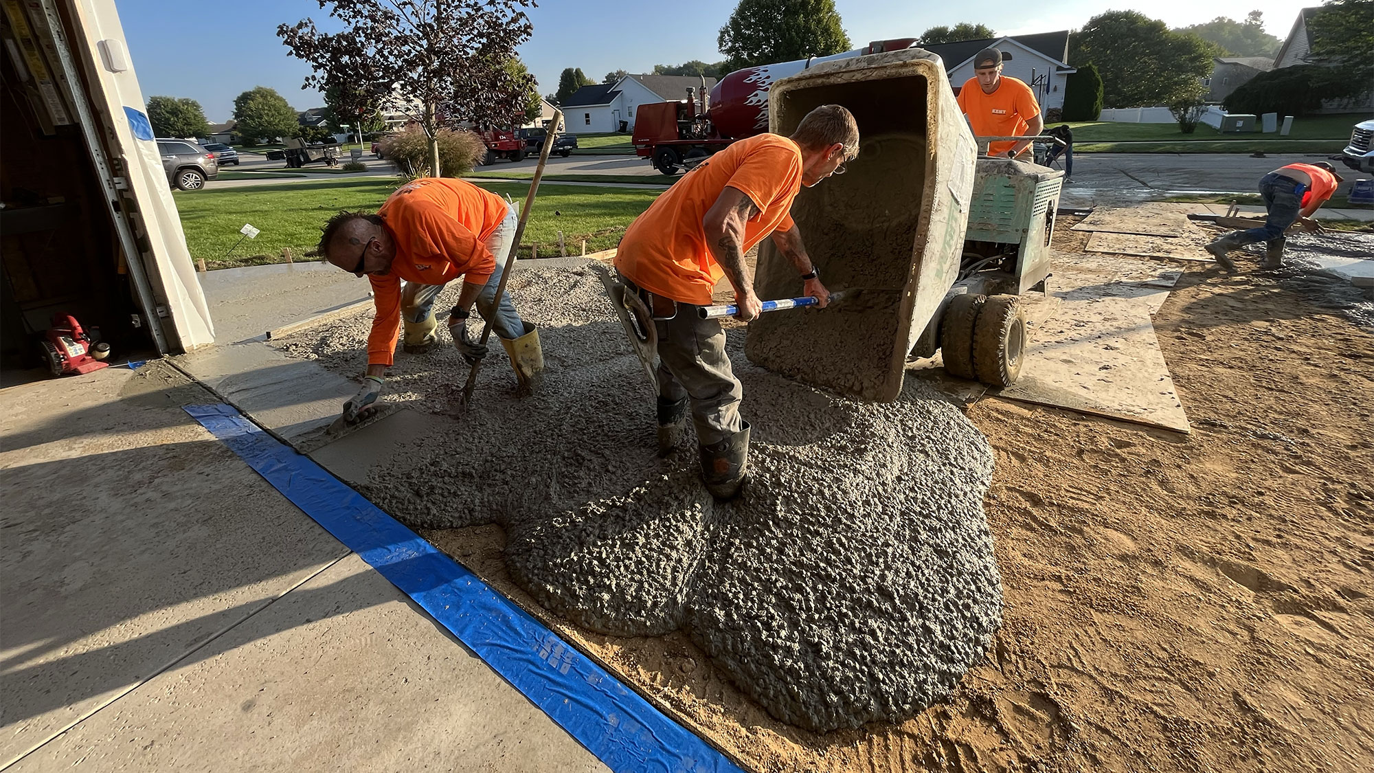 We’ll schedule a start date with you and will be there between 7am and 6pm. We don’t make specific appointment times and you don’t need to be home. If the work is in a garage, we will contact you regarding access. We will take care of contacting MISSDIG and pulling any permits that are necessary. Before your start date, ensure that there is a 2’ perimeter around the workspace clear of landscaping obstructions such as plants/bushes, metal or block edging, sprinkler lines/heads, fencing, and any other materials that you do not want disturbed during excavation. Move any cars out of the workspace and park down the street to allow room for construction vehicles. Turn off any sprinklers for at least 48 hours. Do not walk on your new concrete for 48 hours and do not drive on your new concrete for 10 days. Keep all heavy vehicle traffic off new concrete for at least 28 days.